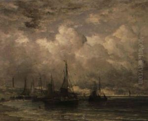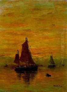 Boats In A Calm, Figures In The Foreground, At Sunset