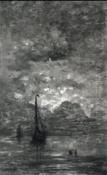 Boats In A Calm, Figures In The Foreground, At Sunset