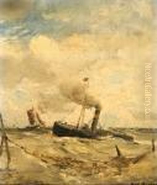 Onstuimige Zee Met Stoomschuit, Op De Achtergrond Een Vissersboot En Op De Voorgrond Een Visnet