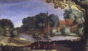 Fluslandschaft Mit Einer Vornehmen Gesellschaft, Im Hintergrund Ein Schlos Oil Painting by Hendrik van der Borcht the Elder
