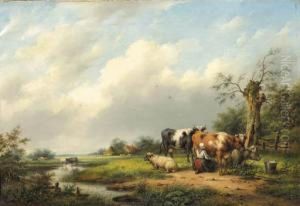 Cattle Drinking From A Ditch, Farmers Milking A Cow By A Farm