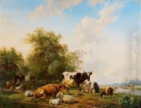 Kuhe Und Schafe Vor Einem Waldchen Bei Einemgewasser.
