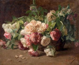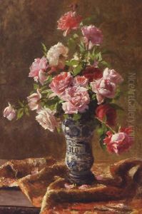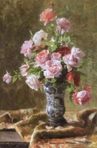 Still Life With Dahlias In A Vase And Roses On A Tabletop