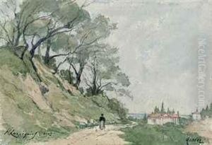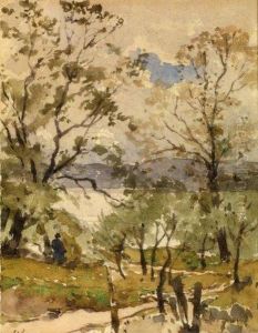 Paysage Avec Un Pecheur Au Bord D'une Riviere