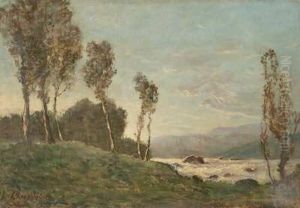 Le Rivage D'un Fleuve, Des Arbres Dans Un Paysage Vallonne A L'arriere-plan