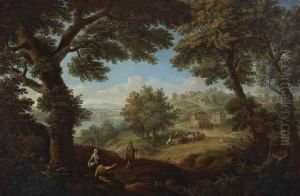 View From A Hillside Of A Town In A River Valley, With Three Figures Resting In The Foreground