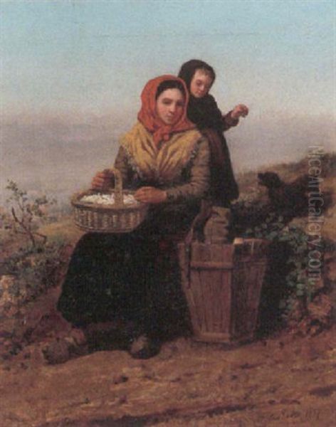 En Bondekone Og Handes Lille Datter Hviler Sig I Vejkanten