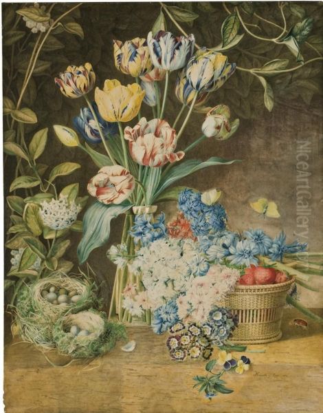A Vase Of Tulips, With Primroses, Carnations, Hyacinths And Violasresting On A Basket Of Strawberries And Two Birds' Nests On Aledge