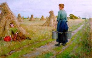 Farm Girl Leaning On A Scythe In A Meadow With A Cottage And Sea In The Distance