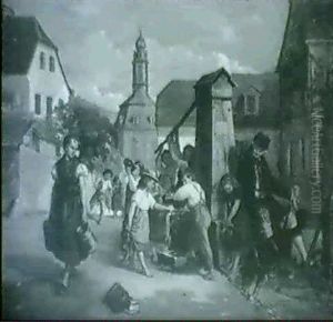 European Market Scene With Coffee Shop Interior To Left And Tents And Figures To Right