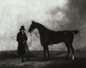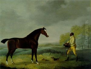 A Groom Standing With A Spotted Bay Mare And Two English Setter, In A Landscape