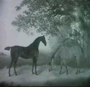 A Black Hunter And A Grey Pony In A Wooded Landscape