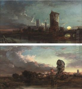 Windmills In An East Anglian Landscape At Dusk (+ A Castle Beside A River; Pair)