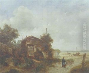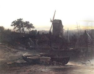 A Twilight River Landscape With Fishing Smacks On The Beach In The Foreground And A Windmill Beyond