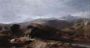 A Welsh Landscape With Figures, Cattle And Sheep Before A Cottage