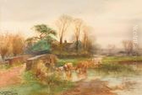 Cattle Watering By A Bridge