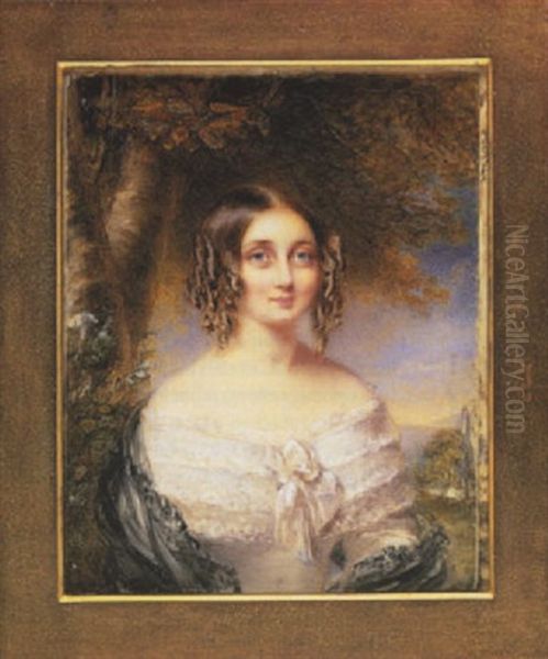 A Lady Of The Bolton Family Wearing Decollete White Dress With Lace Bodice And Bow At Her Corsage, Black Lace Shawl And Her Hair In Ringlets