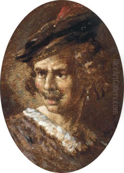 Portrait Of A Man, Bust-length, In A Black Hat With A Red Feather