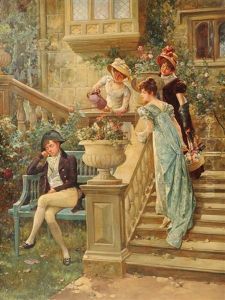 A Soldier And A Lady Conversing In A Stately Garden Whilst Another Couple Walk Back Towards The House