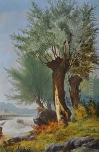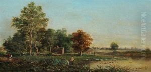 River Landscape With Figures In A Punt Near A Homestead