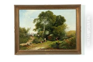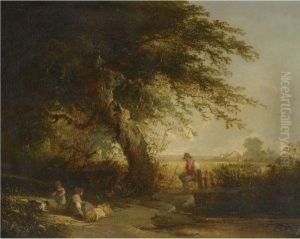 A Wooded Landscape With Children Filling A Pail In The Foreground