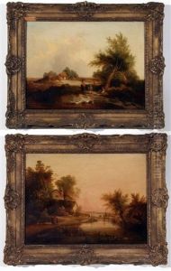 Figures And Donkeys Resting In A Landscape; Mother, Child And Dog By River And Cottage (pair)