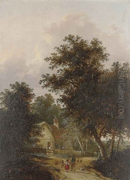 Figures Outside A Cottage (: Driving Home The Sheep; Pair)