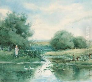 Two Children By A Pond In A An Extensive Landscape