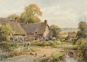 Two Children Sitting On A Riverbank Before A Thatched Cottage