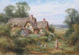 A Thatched Cottage With Chickens In A Rural Landscape