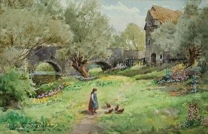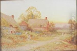 A Mother And Child With Geese Before A Thatched Cottage In Early Autumn