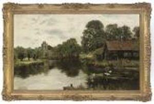 River Landscape With Geese Before Afarmyard