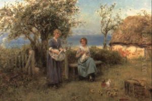 Children On A Bridge By A Thatched Cottage