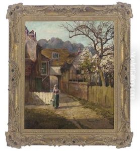 View Of A Timbered Thatched Cottage With A Mother And Young Girl Under A Blossom Tree