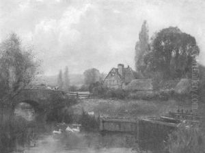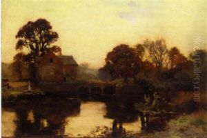 River Landscape With Figure On A Bridge At Dusk