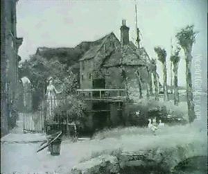 Ancient Cottage And Bridge With Figures On A Roadway