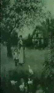Children On A Bridge By A Thatched Cottage
