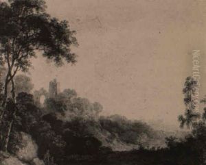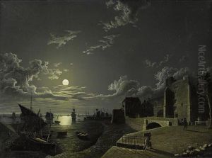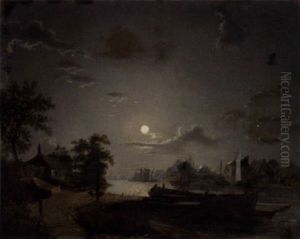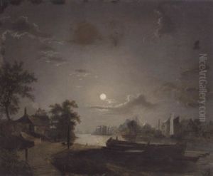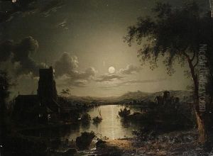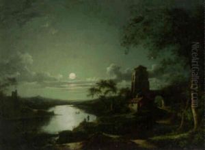 A Moonlit River With Figures Fishing Before A Castle
