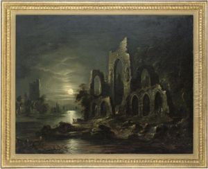 Figures In A Moonlit River With A Ruined Abbey Beyond