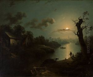 Figures In An Extensive Moonlit River Landscape
