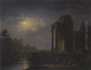 A Moonlit River Landscape With Horsemen By Ruins
