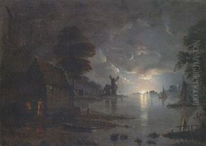 Figures By A Cottage In A Moonlit Lake Landscape With Boats And A Windmill Beyond