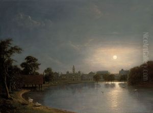 Figures Before A Lake In A Moonlit Landscape With A Town Beyond