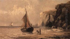 Figures By A Grounded Ship With Other Sailing Vessels In Calm Seas Beyond
