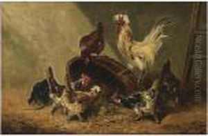 Chickens With A Rooster In A Barn