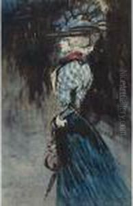 Une Femme Au Chapeau Vue De Dos, Deux Autres Personnages A L'arriere-plan