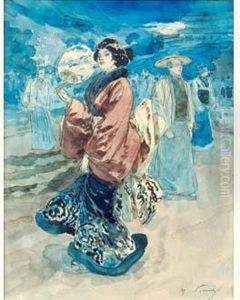 Japonaise En Kimono, Une Ombrelle A La Main; Et Une Elegante Regardant Un Samourai Avec Son Epee