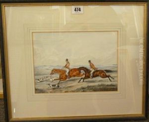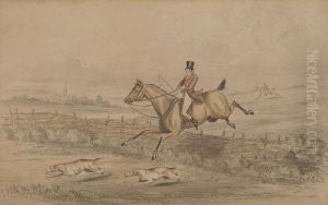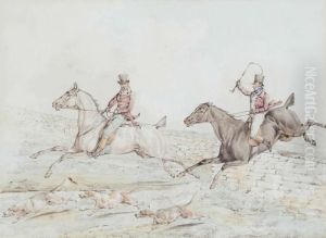 Two Riders and a Couple of Hounds Clearing a Wall