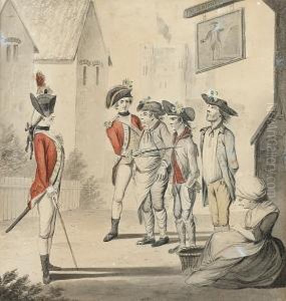 The Unfortunates Outside The Old Fortune Tavern Being Press Ganged By Two Young Officers; A Visit To The Camp. Maccaroni And A Lady Being Shown A Military Camp By Young Ensigns, Two