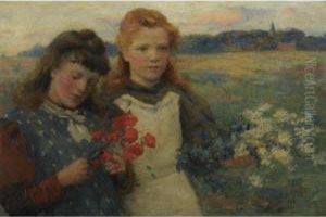 Two Young Girls Picking Wild Flowers